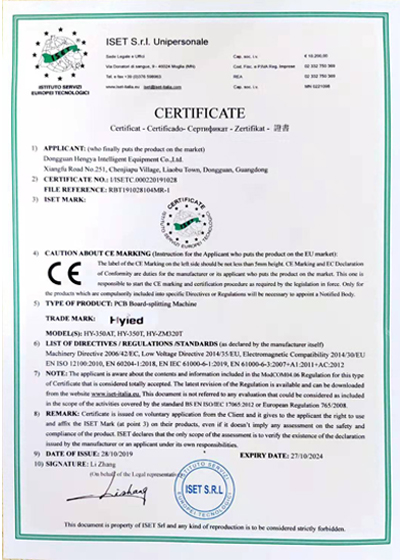 近日,經過認證機構的嚴格審查,恒亞自主研發的HY-350AT在線分板機、HY-350T離線分板機以及HY-ZM320T桌面型分板機等系列產品通過了安全、環保等各項指標測定,獲得歐盟認證機構頒發的CE認證證書,這標志著恒亞產品符合歐盟相關指令的要求,已經獲得歐洲市場的銷售許可。